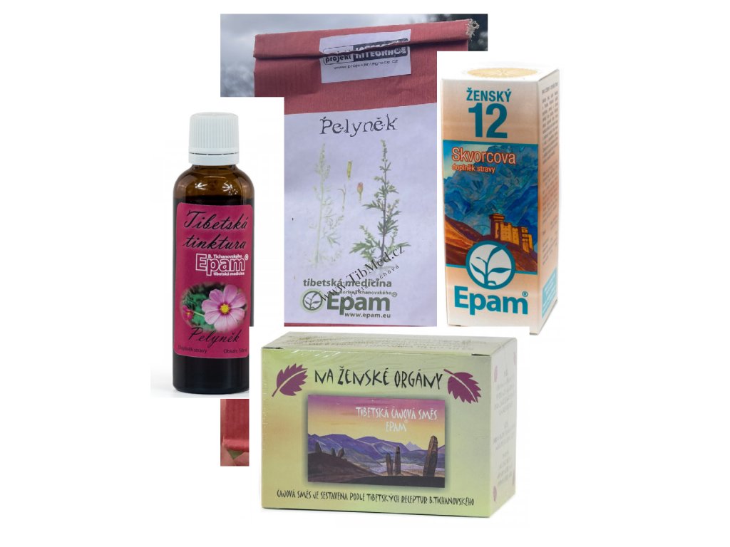 1 x sáček sušeného pelyňku 50 g + 1 x tinktura pelyněk 50 ml + 1 x Epam 12 50 ml + 1 x čaj pro ženy 40 g
